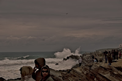 The carpark we called home was coincidentally also home to the travelling World Pro Surfing circus for a couple of weeks as the worlds best surfers earned their transient livings, and as I stumbled to the loo the breaking news was that Fanning and Knox were readying the jet-skis to tow-in to the huge waves lashing the headlands around the crescent shaped bay. I don’t really follow the pro surfer thing, but the the excitement was palpable and we gulped coffee and rushed to the headland to join the throng watching the spectacle. It really was an amazing spectacle to observe, for these guys to not only survive, but to feel so comfortable amidst the power, fury and energy of the storm, energy created and stored at the epi-centre of a storm thousands of miles away, transferred across the ocean and unleashed on our beach for us to watch and for them to tussle with.